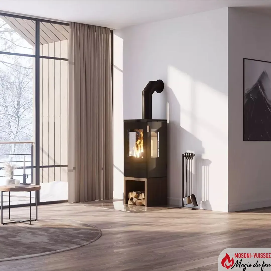 Les grandes vitres en verre offrent une vue incomparable sur le jeu des flammes. Les vitres latérales à double vitrage assurent des températures de foyer plus élevées et donc des vitres propres plus longtemps. Le socle en acier sur lequel est présenté le Galileo offre de la place pour le stockage du bois.