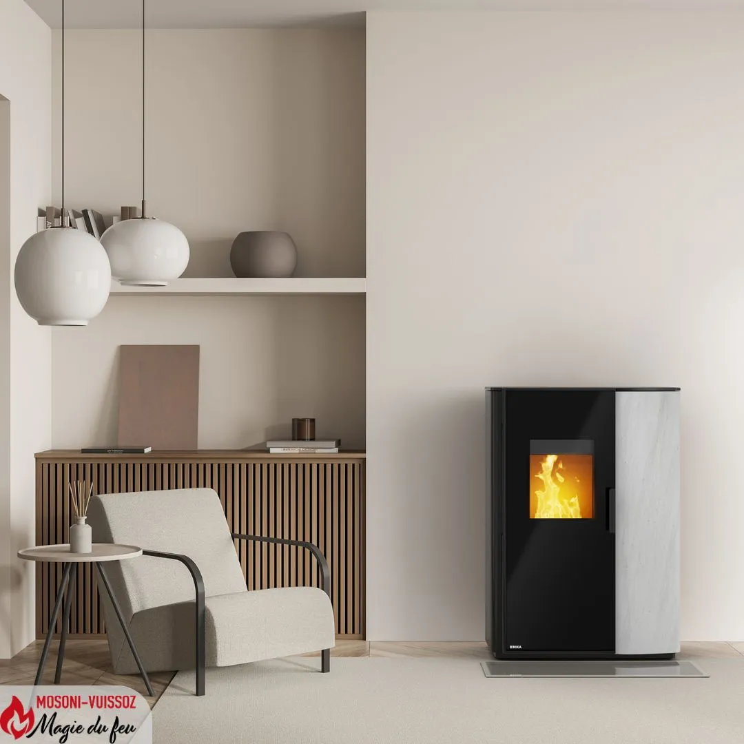 Grâce à la polyvalence de ce poêle, vous pouvez choisir entre des bûches et des granulés. Si vous utilisez du bois, optez pour la méthode traditionnelle et profitez du spectacle des flammes dansantes. Avec les granulés, vous pouvez allumer le feu à distance et, grâce à l’application sur votre smartphone, maintenir une température constante afin de retrouver une maison confortable à votre arrivée.